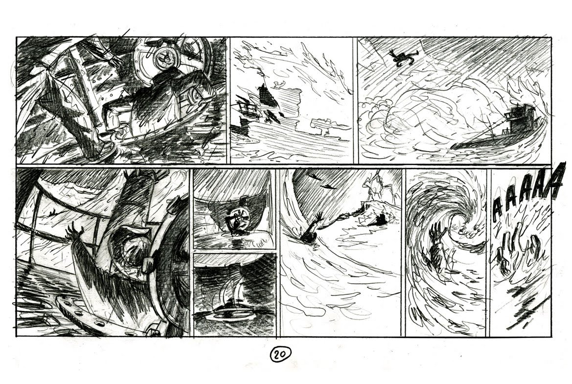 5 pages noir et blanc du U-Boat. Ce sont les toutes premières planches, le style a changé depuis, le format aussi (de vertical devient horizontal) et la couleur est arrivée.
